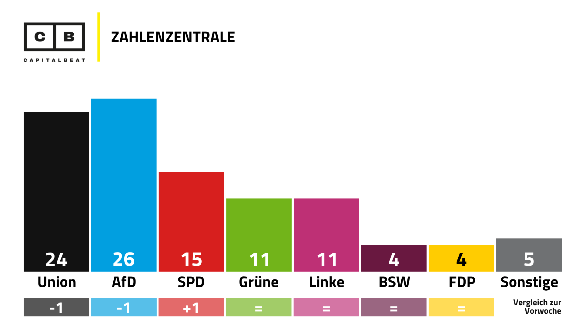 ARD-Deutschlandtrend: Union 29 Prozent, AfD 19 (+1), SPD 17 (-1), Grüne 15, FDP 6 (-1), Linke 4.