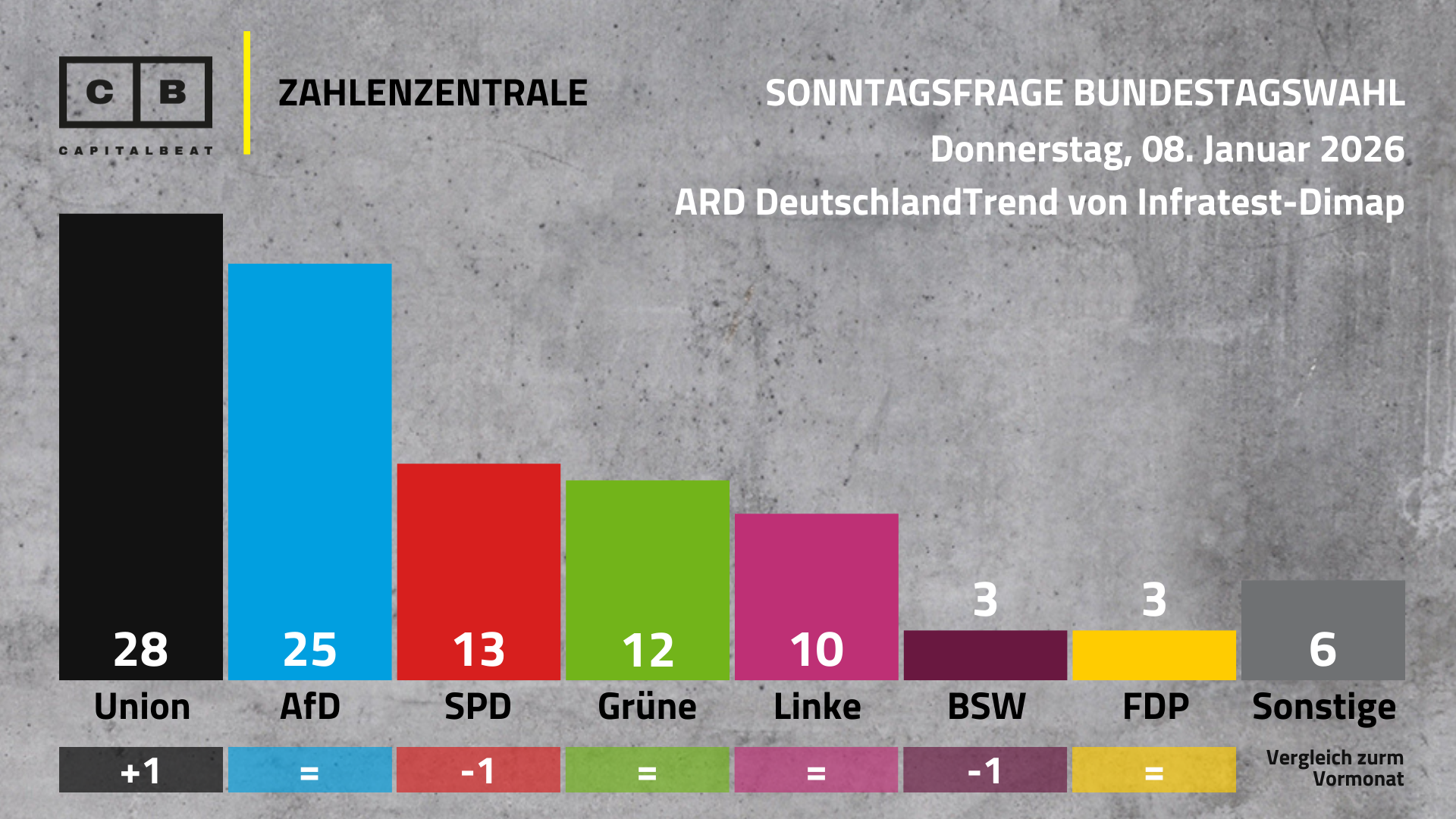 Union 28 Prozent (+1), AfD 25 Prozent, SPD 13 Prozent (-1), Grüne 12 Prozent, Linke 10 Prozent, BSW 3 Prozent (-1), FDP 3 Prozent, Sonstige 6 Prozent.