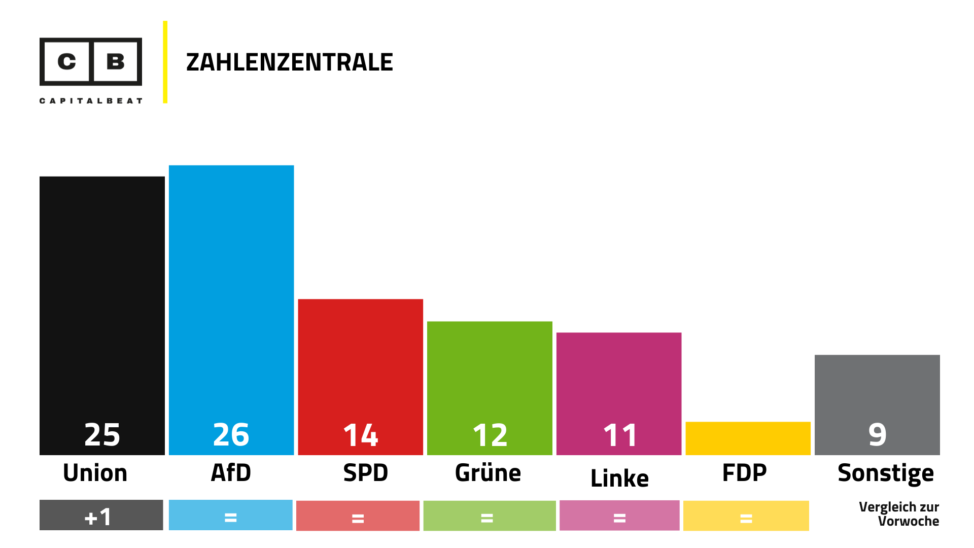 Union 25 Prozent, AfD 26 Prozent, SPD 15 Prozent, Grüne 11 Prozent, Linke 10 Prozent (-1), BSW 4 Prozent, FDP 3 Prozent, Sonstige 6 Prozent.