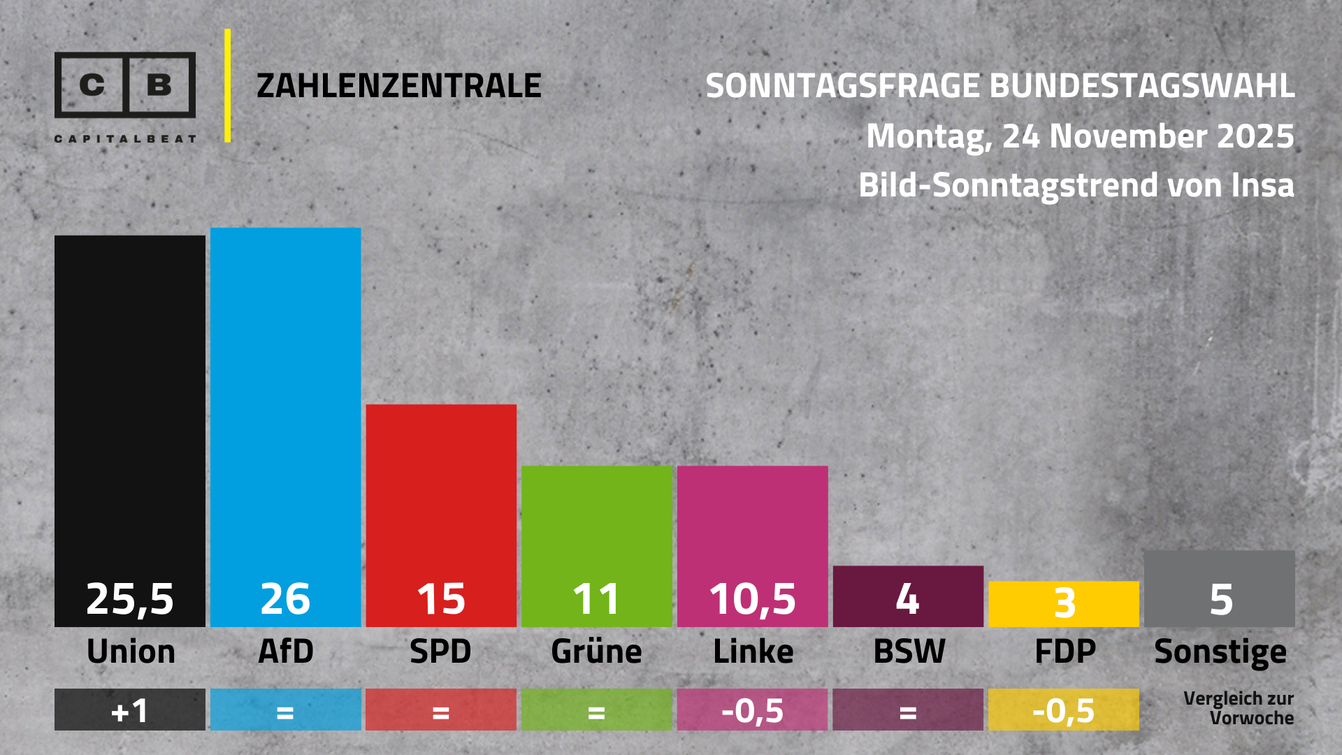 Union 25,5 Prozent (+1), AfD 26 Prozent, SPD 15 Prozent, Grüne 11 Prozent, Linke 10,5 Prozent (-0,5), BSW 4 Prozent, FDP 3 Prozent (-0,5), Sonstige 5 Prozent.