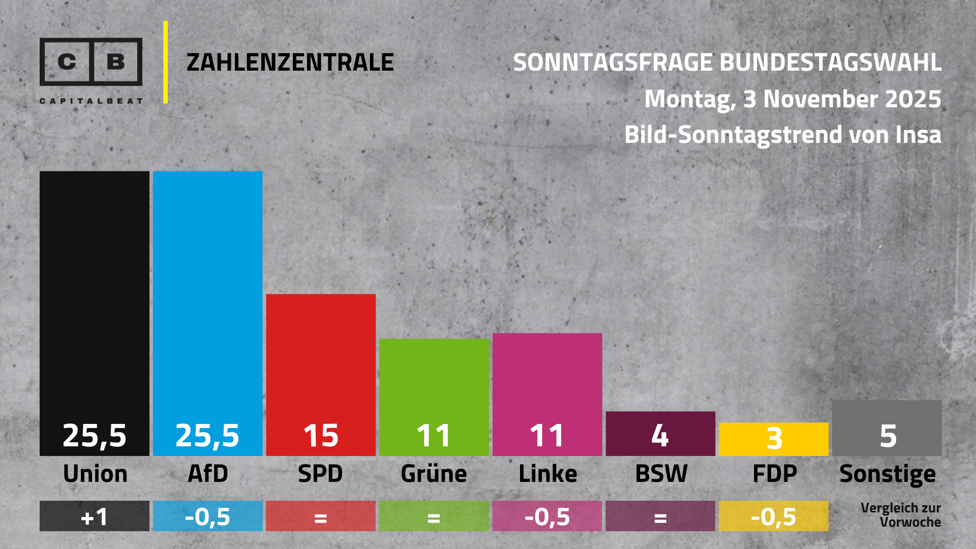 Union 25,5 Prozent (+1), AfD 25,5 Prozent (-0,5), SPD 15 Prozent, Grüne 11 Prozent, Linke 11 Prozent (-0,5), BSW 4 Prozent, FDP 3 Prozent (-0,5), Sonstige 5 Prozent.