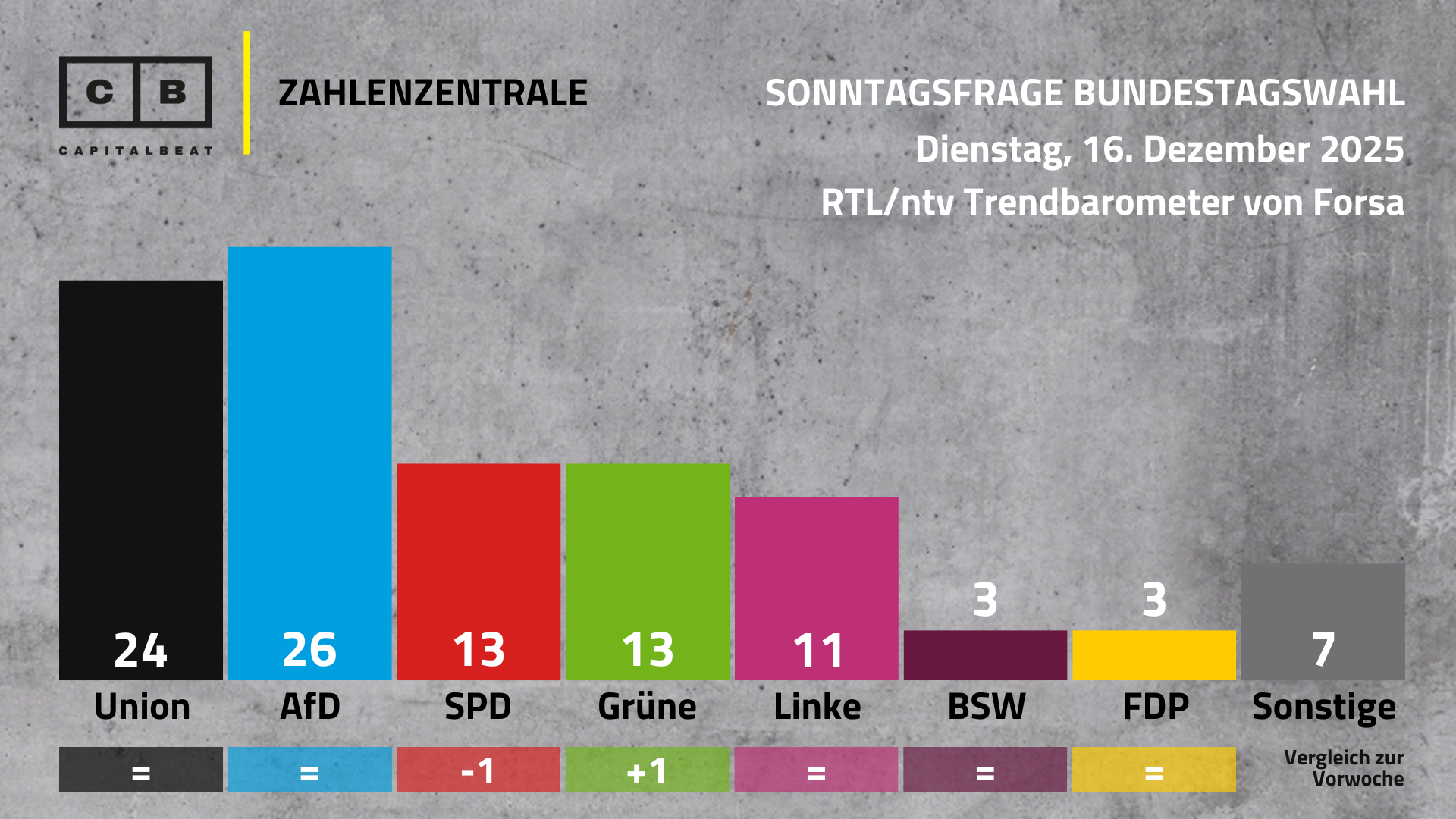 Union 24 Prozent, AfD 26 Prozent, SPD 13 Prozent (-1), Grüne 13 Prozent (+1), Linke 11 Prozent, BSW 3 Prozent, FDP 3 Prozent, Sonstige 7 Prozent.