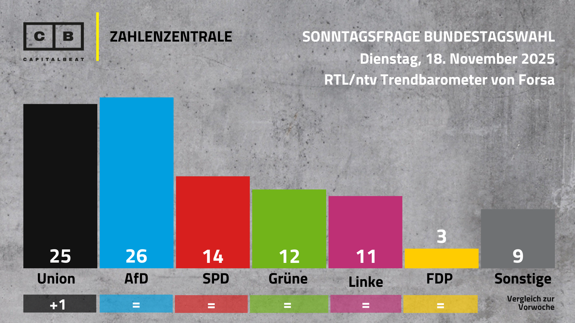 Union 25 Prozent (+1), AfD 26 Prozent, SPD 14 Prozent, Grüne 12 Prozent, Linke 11 Prozent, FDP 3 Prozent, Sonstige 9 Prozent.