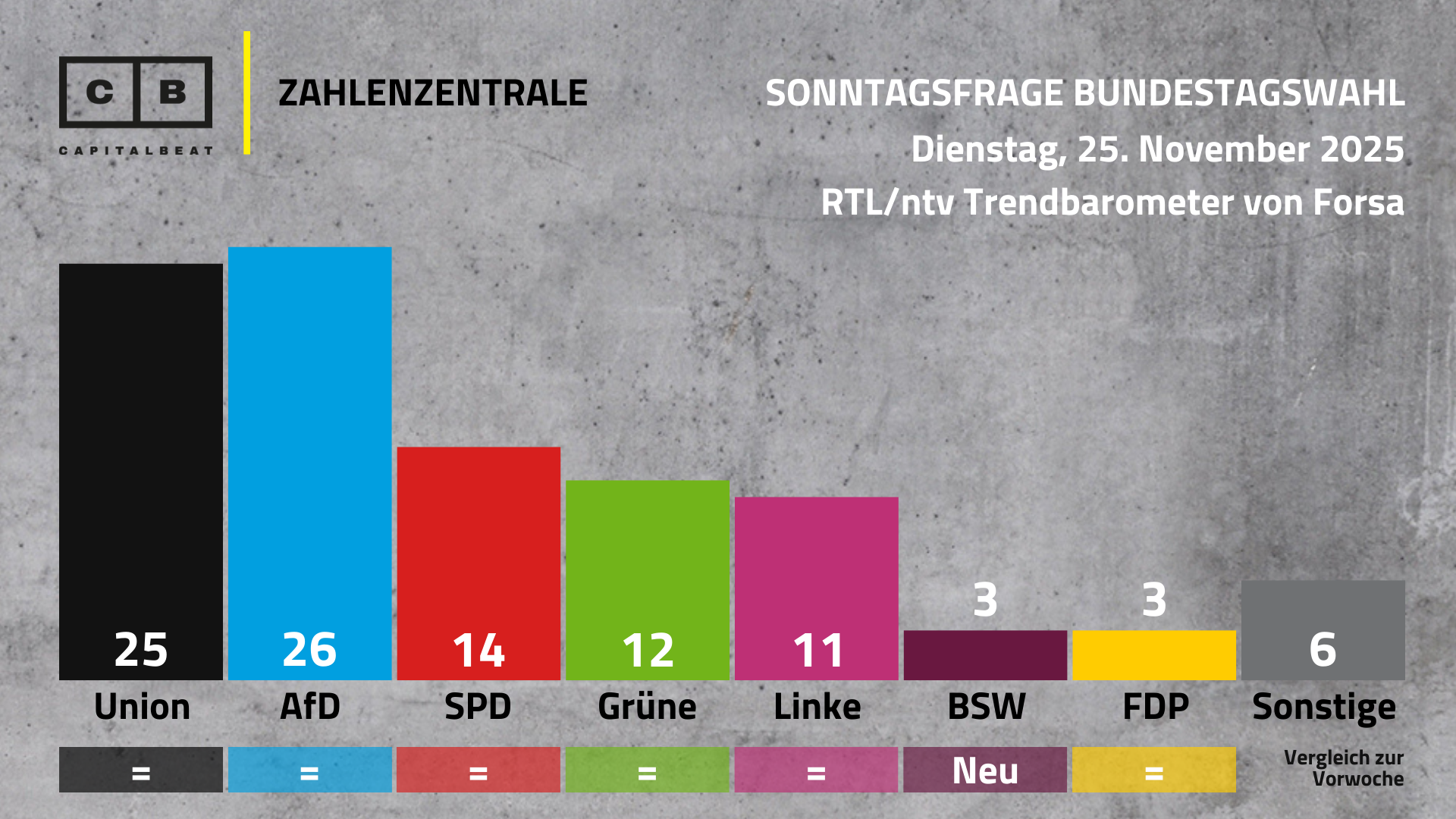 Union 25 Prozent, AfD 26 Prozent, SPD 14 Prozent, Grüne 12 Prozent, Linke 11 Prozent, BSW 3 Prozent (Neu) FDP 3 Prozent, Sonstige 6 Prozent.