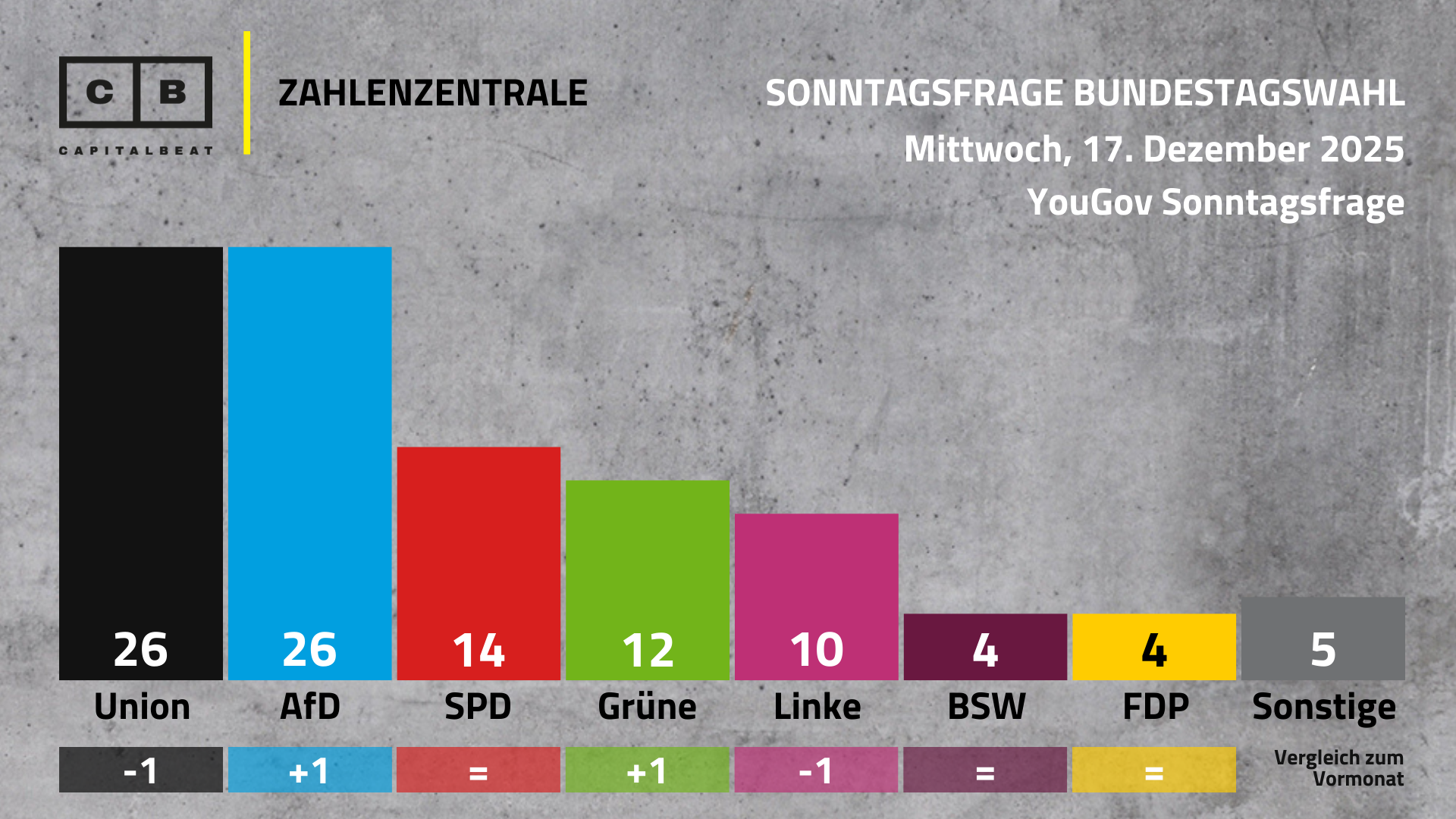 Union 26 Prozent (-1), AfD 26 Prozent (+1), SPD 14 Prozent, Grüne 12 Prozent /+1), Linke 10 Prozent (-1), BSW 4 Prozent, FDP 4 Prozent, Sonstige 5 Prozent.