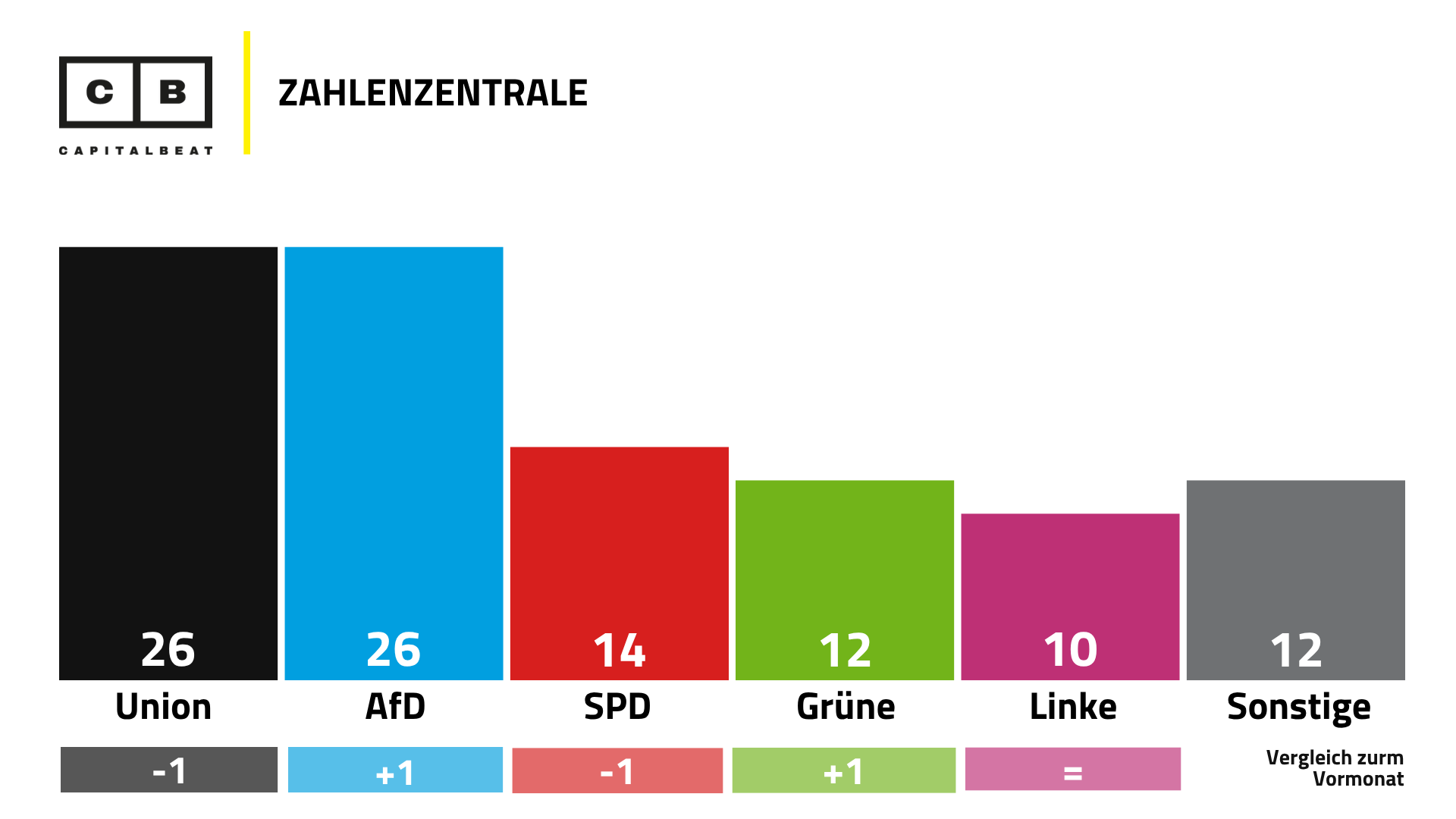 Union 26 Prozent (-1), AfD 26 Prozent (+1), SPD 14 Prozent (-1), Grüne 12 Prozent (+1), Linke 10 Prozent, Sonstige 12 Prozent.